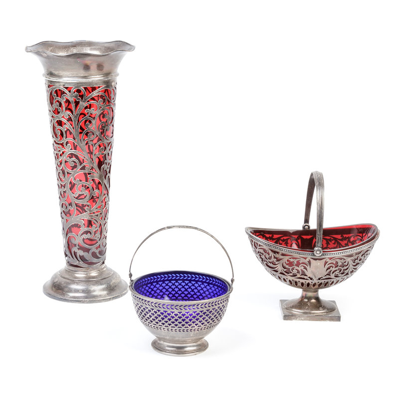 Three American Silver Overlay and Colored Glass Articles