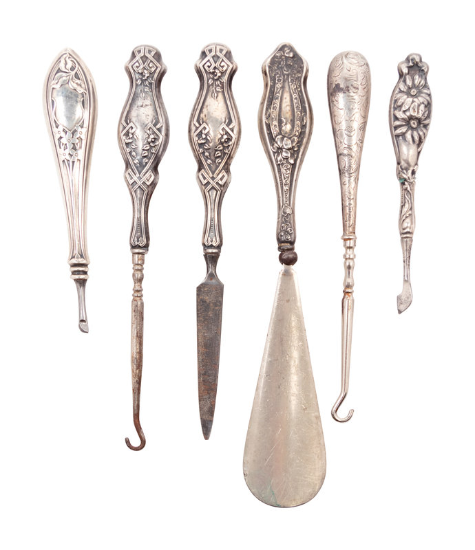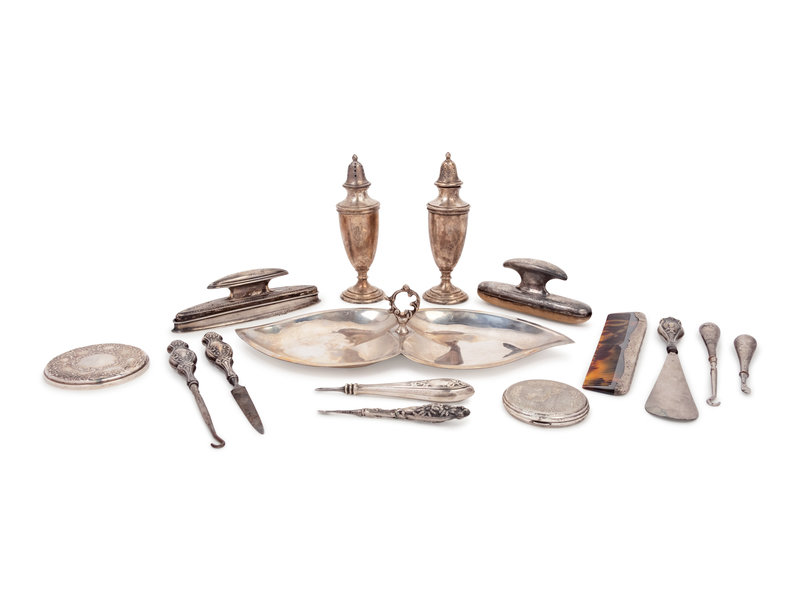 comprising a weighted 3-light candelabrum, Fisher Silversmiths Inc., Jersey City, NJ; a Mexican leaf-form dish; a pair of salt and pepper shakers, Avon Sterling; a circular hand mirror, Towle Silversmiths, Newburyport, MA; a Mexican compact; a silver and tortoise shell comb, Wilcox Silver Plate Co., Meriden, CT; two button hooks stamped Sterling; a nail file stamped Sterling; a shoe horn stamped Sterling; 2 cuticle knives stamped Sterling; a cuticle knife stamped F&B Sterling; a nail buff, Simpson, Hall, Miller & Co., Wallingford, CT and a nail buff, The McChesney Co., Newark, NJ; 16 items total.