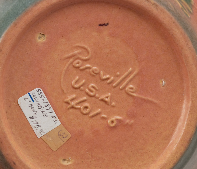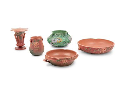 four examples with raised Roseville U.S.A. marks to the underside, the fifth example with a Roseville foil label.