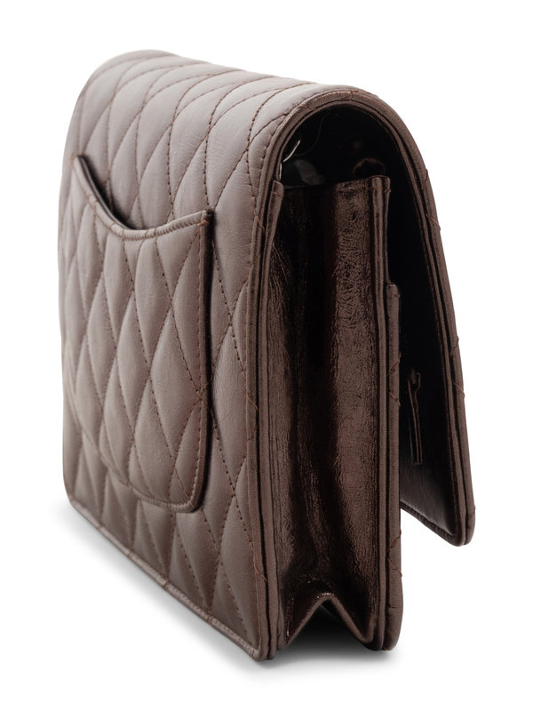 Brown quilted leather flap wallet bag with Ruthenium-tone and leather braided chain shoulder strap and front snap closure.
