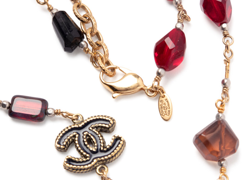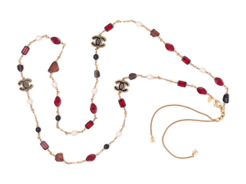 Gold-tone chain necklace with red, brown, and black stones, faux pearls, and rhinestone set CC logo charms.