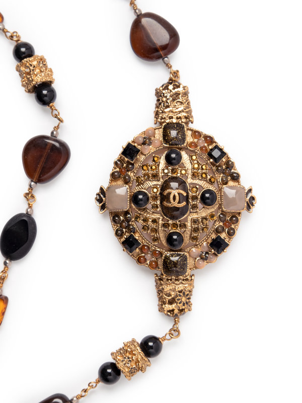 Gold-tone chain necklace with stone beads, gold-tone metal beads, and attached Byzantine-style cross brooch set with stones and CC logo.