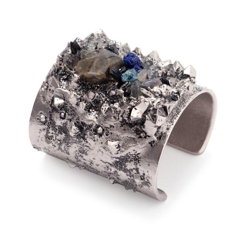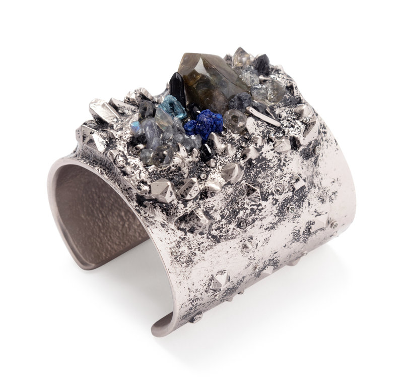Silver-tone cuff with crystal accents, azurite, moonstone, labradorite, tourmaline, topaz, and quartz. Stamped CC logo on interior cuff. Comes with dust bag and box.