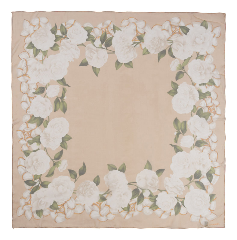 Beige and ivory floral print silk chiffon scarf.