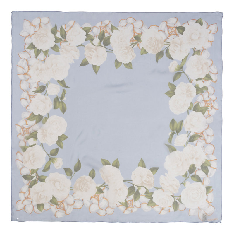 Blue and white floral print silk chiffon scarf.