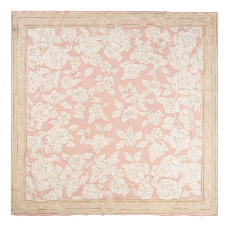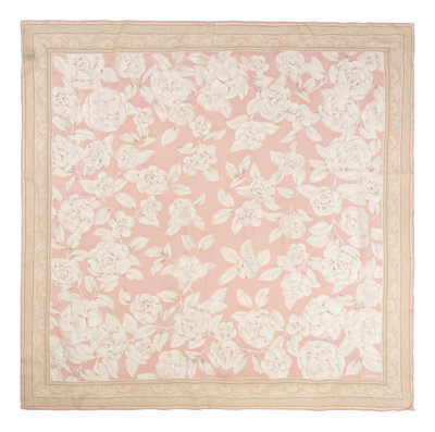 Pink and ivory floral print silk chiffon scarf.