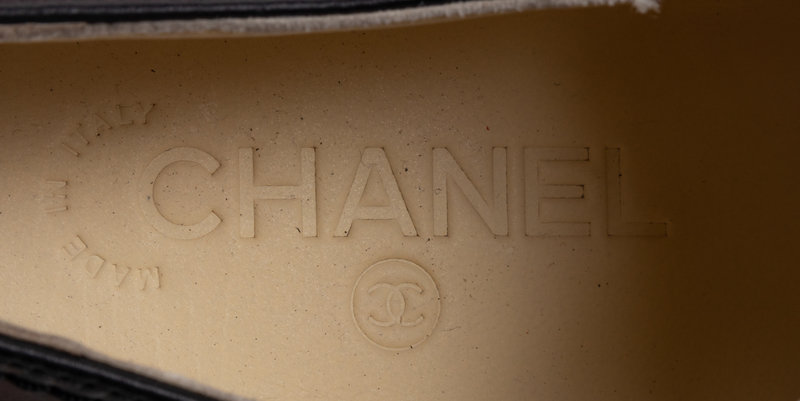 Black leather oxfords with brown leather accents. Found with original sales tag, listed price: $925.00. Comes with dust bags, box, and extra pair of shoe laces.