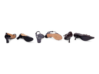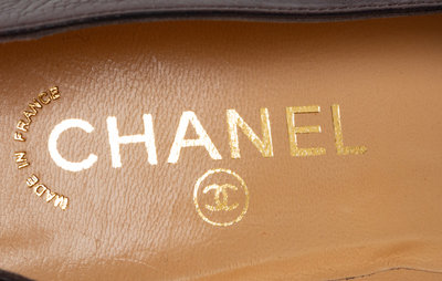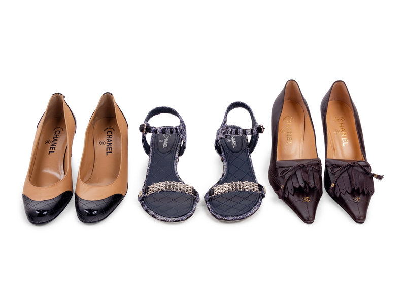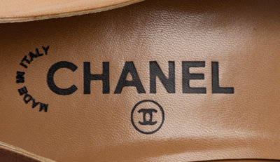 Beige leather pumps with quilted black patent leather toe and heel accents.
