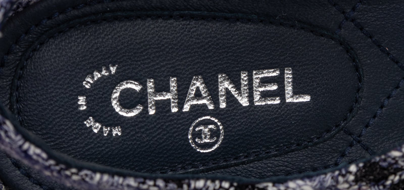 Blue and black tweed strap sandals with navy leather accents and braided chain toe strap. Found with original sales tag, listed price: $800.00. Comes with dust bags and box.