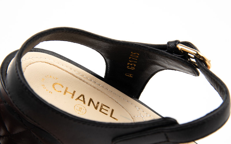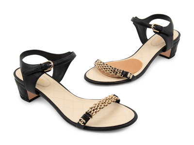 Black lambskin leather strap sandals with quilted leather heels and gold-tone chain toe strap. Found with original sales tag, listed price: $800.00. Comes with box.