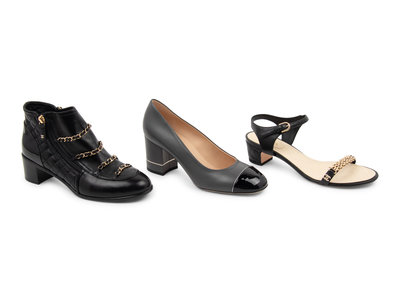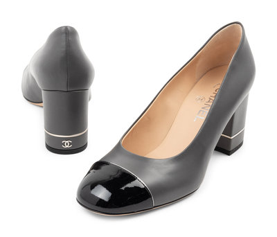 Gray leather chunky heel pump with black patent leather toe and silver-tone metal accents. Found with original sales tag, listed price: $800.00. Comes with dust bags and box.