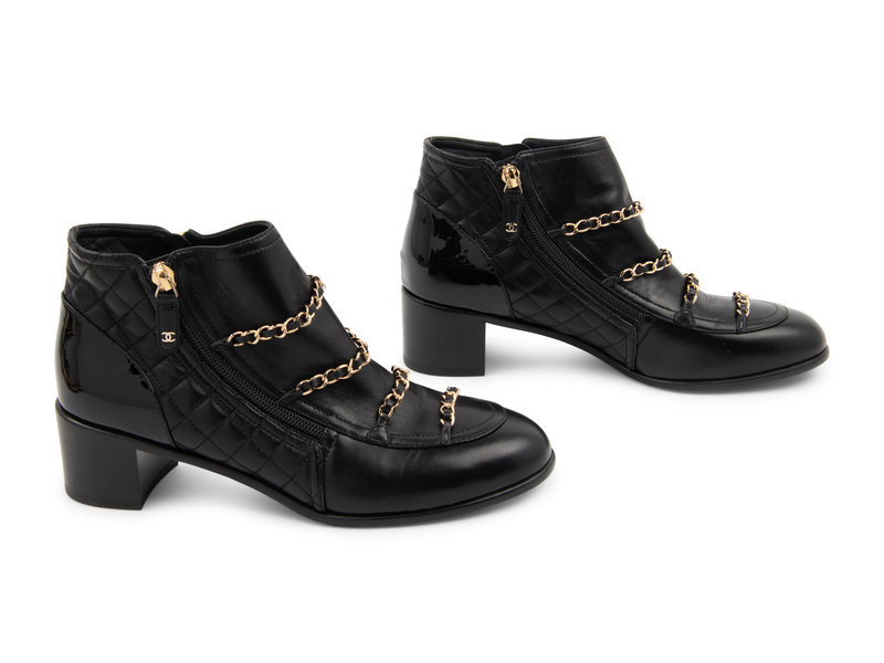 Black quilted lambskin leather short boots with patent leather accents and braided gold-tone chain and leather details. Found with original sales tag, listed price: $1,500.00. Comes with dust bags and box.