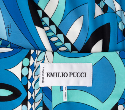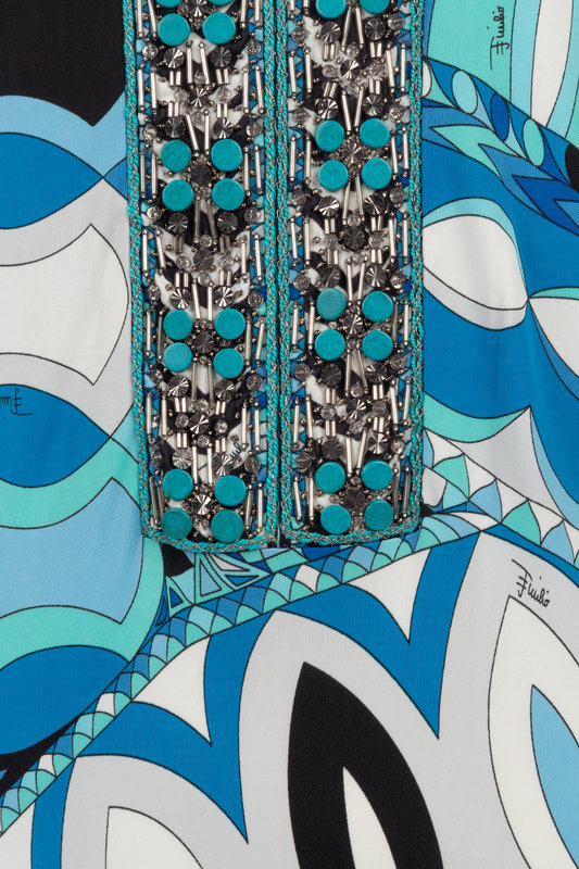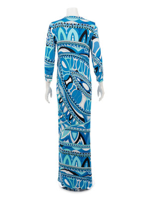 Multi-tone blue and white rayon knit long sleeve dress with geometric print and front silver-tone bead embellishment. Found with original sales tag, listed price is missing.