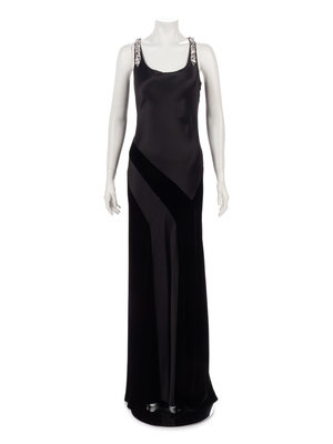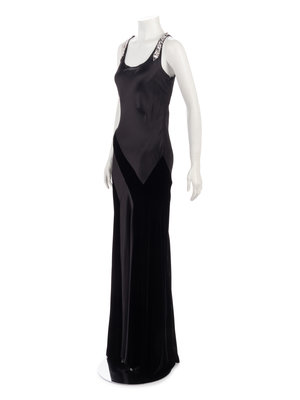 Black silk satin evening dress pieced with black rayon/silk blend velvet, embellished with clear rhinestones on shoulder straps, and left side zipper closure.