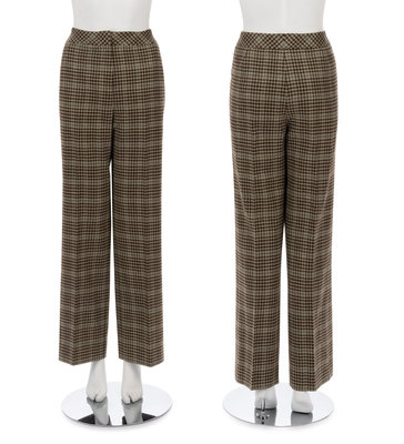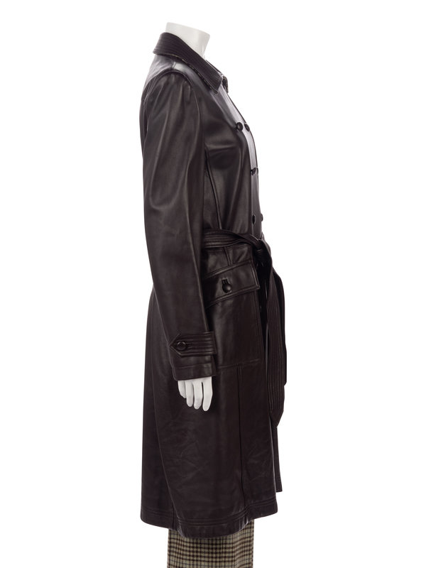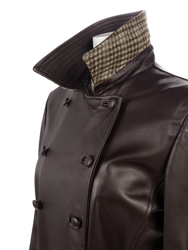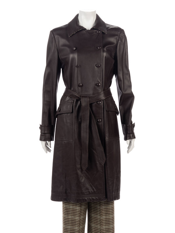 Brown double breast leather belted trench coat with green and brown houndstooth collar backing, front hip pockets, cinched sleeve hems, and covered button closures; paired with matching houndstooth cashmere pair of pants.