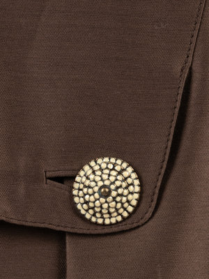 Brown cotton/silk blend double breast box cut jacket with rolled collar, front hip flaps, and front metal and enamel button closures.