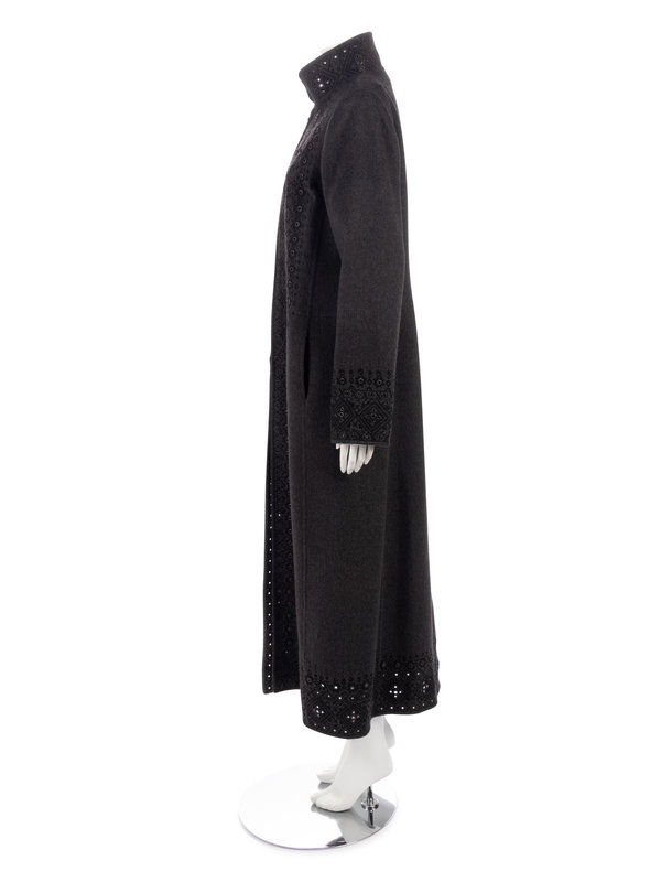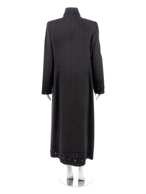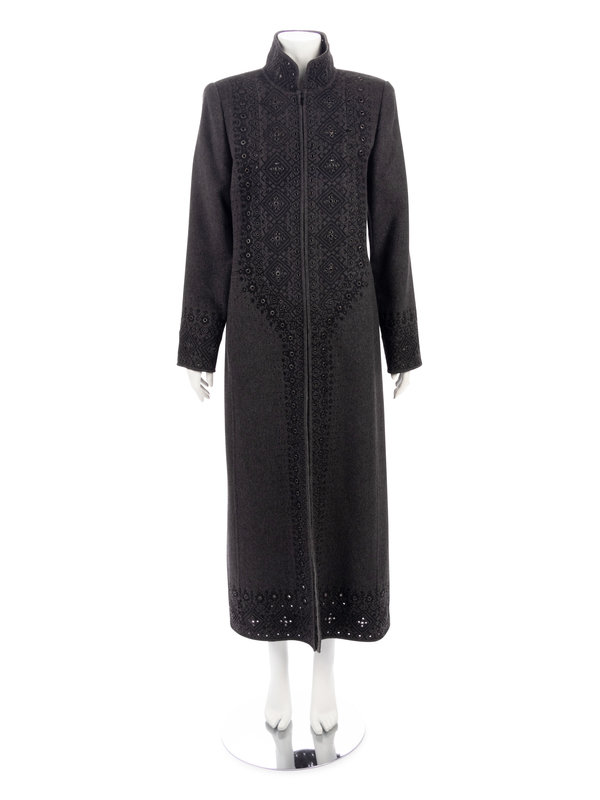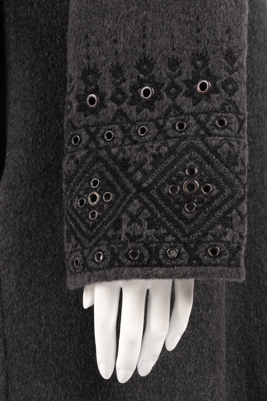 Dark gray cashmere top coat with black embroidery and metal grommet details, stand collar, and center front zipper closure.