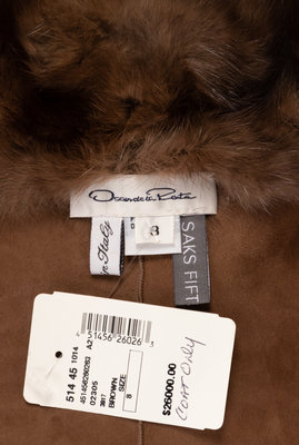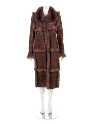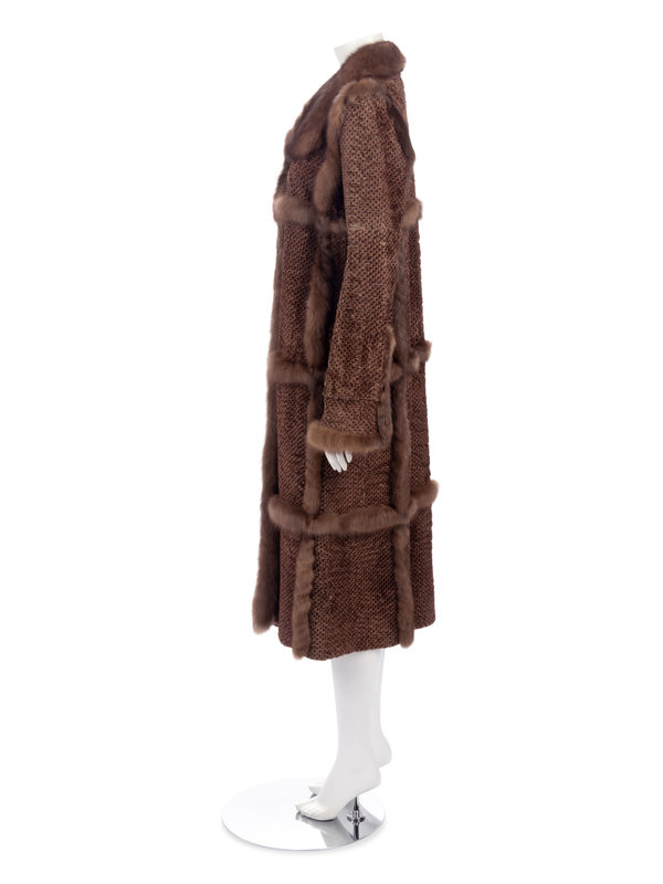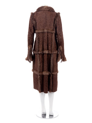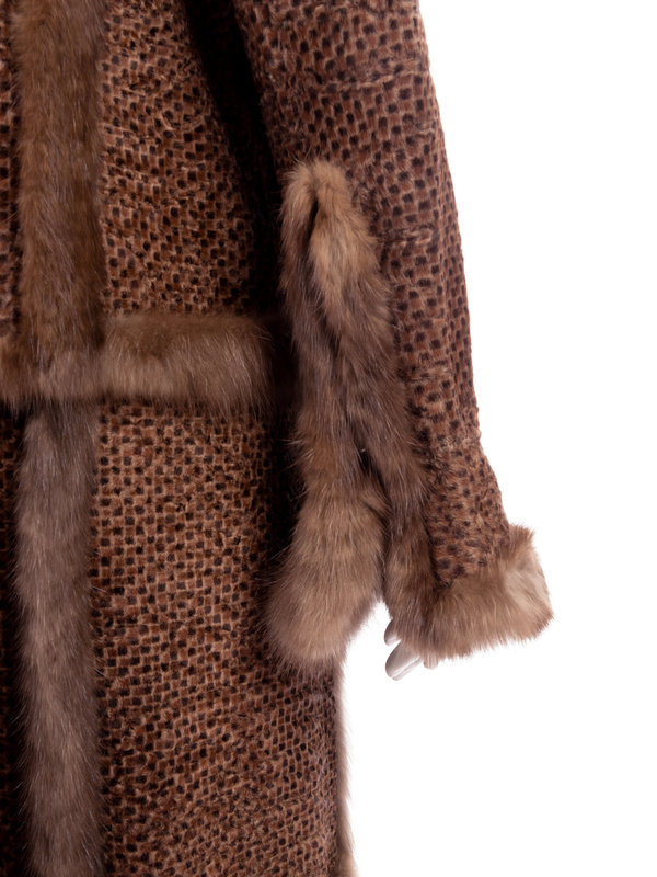 Brown checkerboard pattern paneled lamb fur coat trimmed with brown sable fur, zippered sleeves, and center front hinged hook and eye closures. Found with original sales tag, listed price: $26,000.00.
