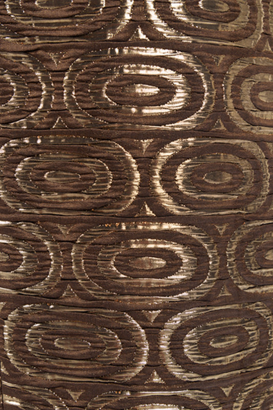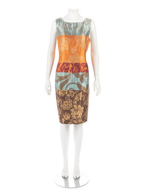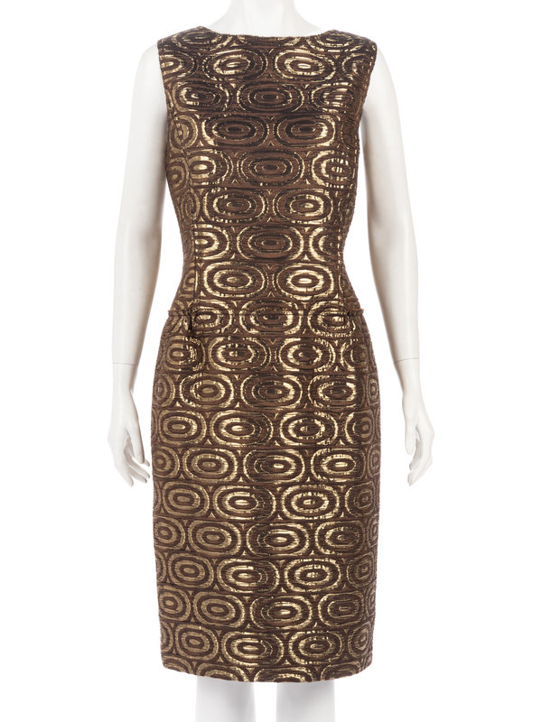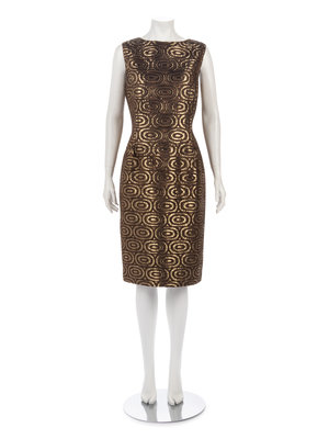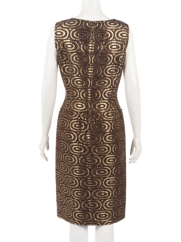 Gold and brown polyester/silk blend lamé sheath dress with overlocked seam finishing and center back zipper closure.