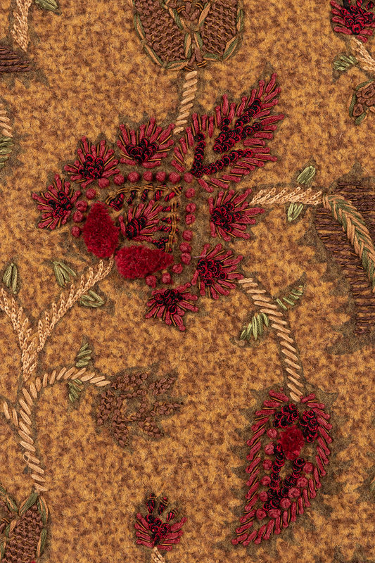 Tan and yellow ochre alpaca/wool blend skirt embroidered with red, green, and brown floral motif, and left side zipper closure.