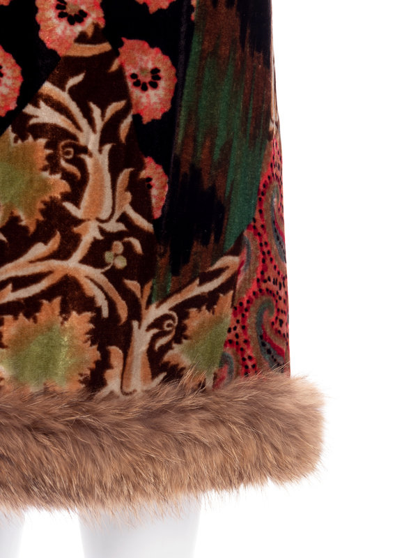 Brown and multi-hued printed rayon/silk blend velvet skirt trimmed with fur.