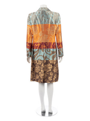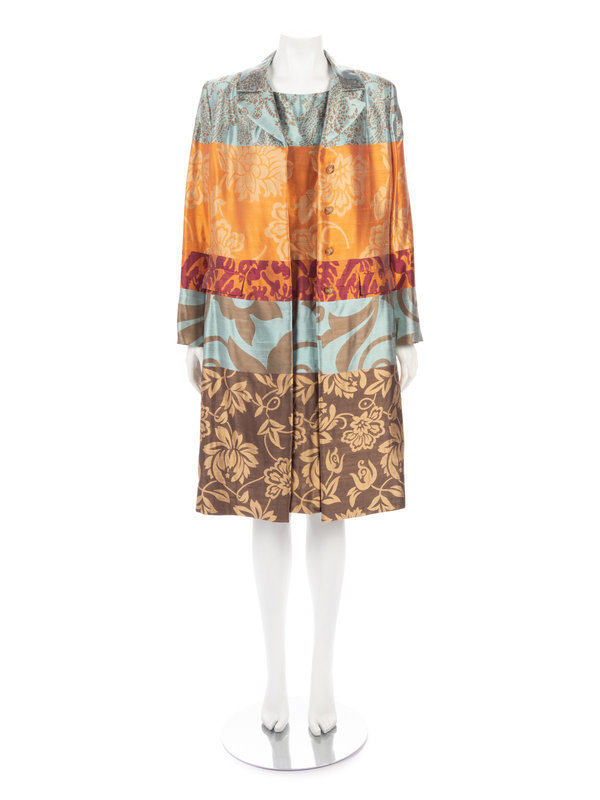 Light blue, orange, and brown silk blend jacquard two-piece ensemble with button down long jacket with fish-eye lapels, front hip flap pockets, and hidden center front button closure; paired with matching sheath dress with center back zipper closure.