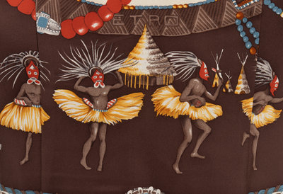 Brown silk short sleeve blouse with African mask and shell print and front button closure. Found with original sales tag, listed price: $720.00.