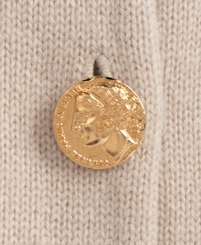 Beige cashmere cable knit cardigan with ribbed knit cuffs and hemline and front button closure.