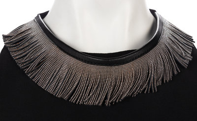 Black silk crepe sleeveless maxi dress with center back zipper closure; paired with metal beaded fringe necklace with black leather and ribbon. Found with original sales tag, listed price: $3,295.00.