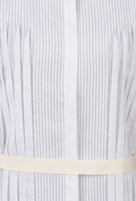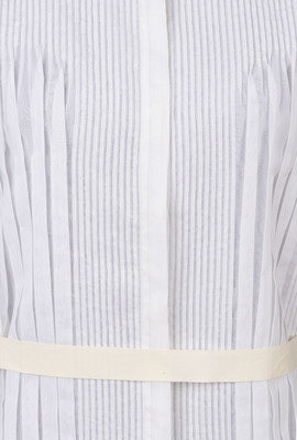 White cotton pleated sleeveless shirt dress with stand collar, and front hidden button closure with cotton tape belt. Found with original sales tag, listed price: $980.00.