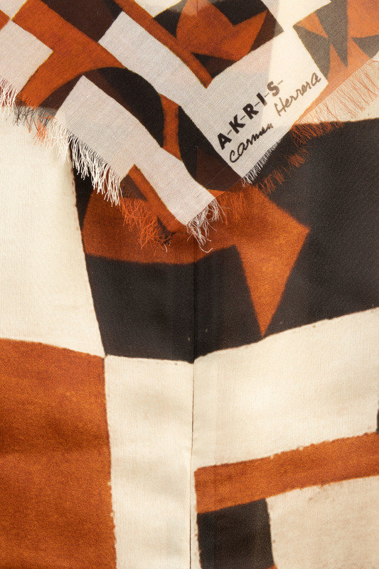 Quoted from marketing booklet included with garment: "Her [Carmen Herrera] sense of color and proportion, a blend of euphoria and perfect order, stunned me [Albert Akris]." This led to the creation of the 2017 Akris collection based on her work. Based on the art piece "Venetian Red, White, and Black" by Carmen Herrera, 1949.
