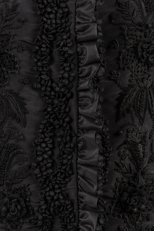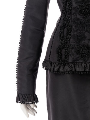 Black silk taffeta two-piece skirt suit with fitted jacket embellished with ruffles and embroidery; paired with matching black silk taffeta skirt. Found with original sales tag on skirt, price is missing.