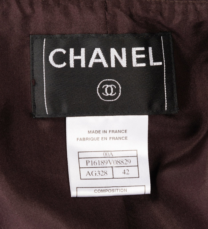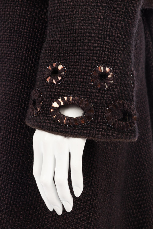 Brown and black wool blend two-piece skirt suit with flared cuffs and zip front jacket embellished with wrapped bronze-tone pailettes; paired with matching flared skirt. Found with attached original sales tag, listed price: $6,850.00.