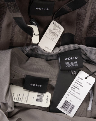 Gray and black silk organza block printed tie front Toccata jacket with black satin and leather dual buckle belt. Found with original sales tag, listed price: $3,500.00.