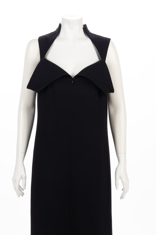 Black wool funnel neck sleeveless maxi dress with zippered seam neckline detail, rolled strips on black net back, and center back zipper closure.
