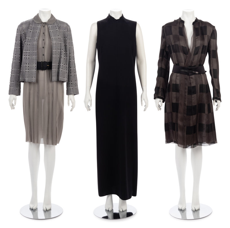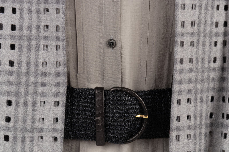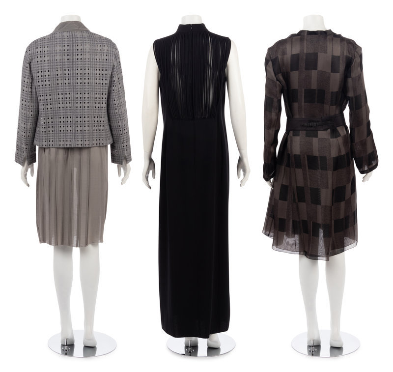 Gray wool/nylon blend die-cut plaid Vamos jacket; paired with gray cotton/silk blend crepe pleated shift dress with slip, and black braided straw and leather belt. Found with original sales tags, listed price on jacket is missing. Listed price on dress: $1,990.00.