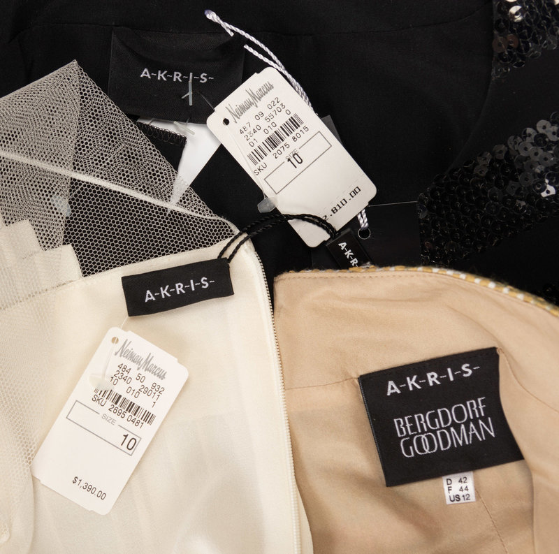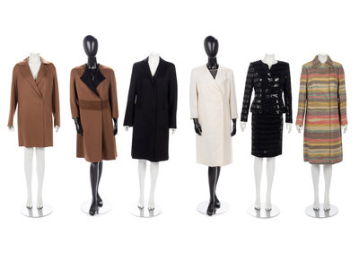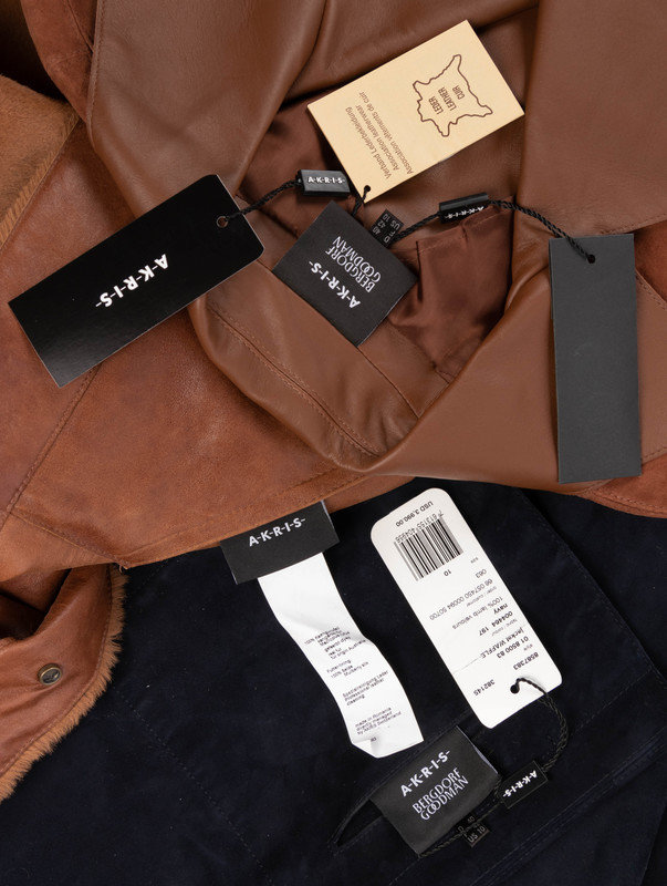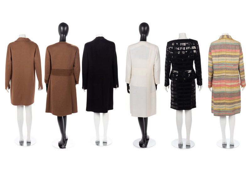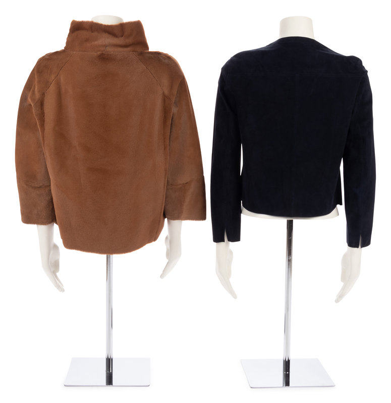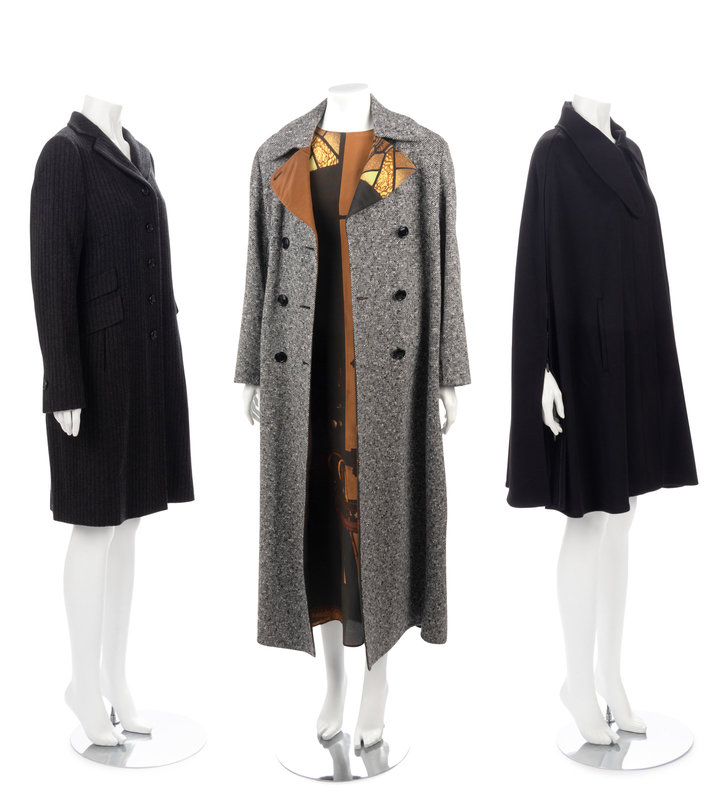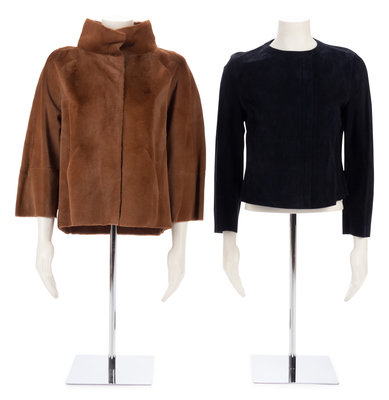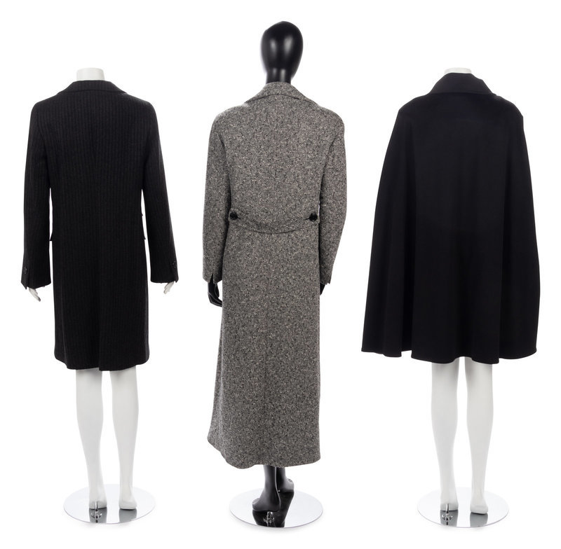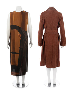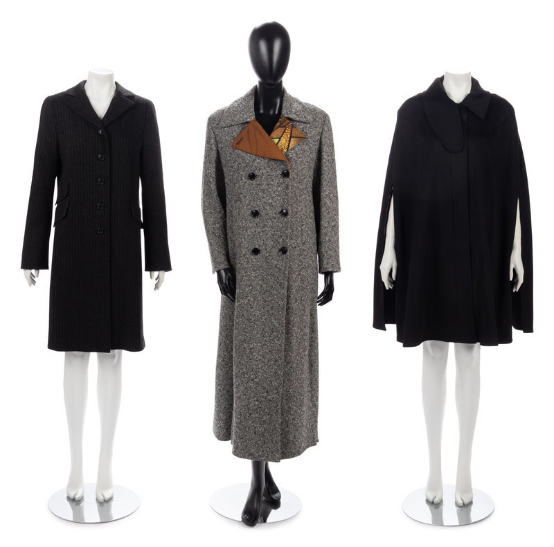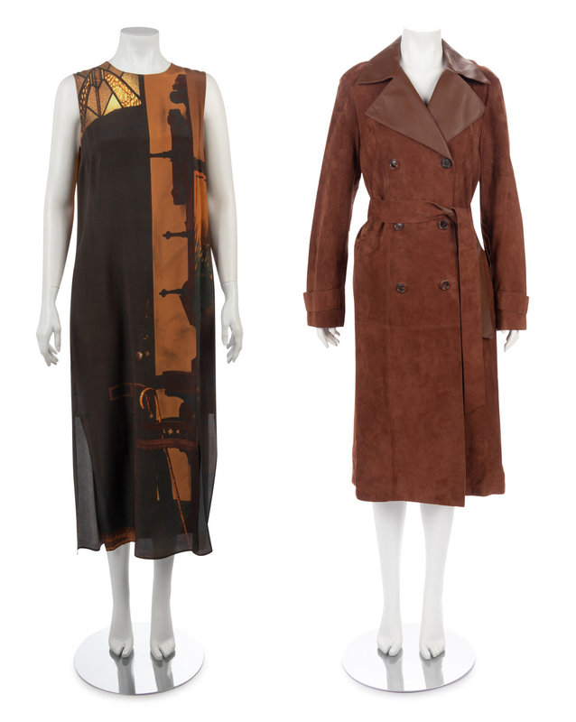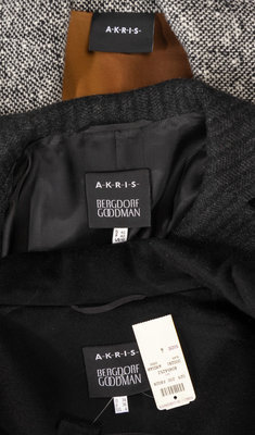 Cream wool/polyester blend long jacket and pleated silk shell top. Jacket found with original sales tag, listed price: $3,990.00. Top found with original sales tag, listed price: $1,390.00.