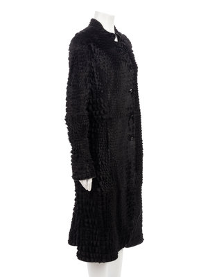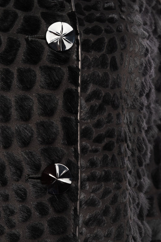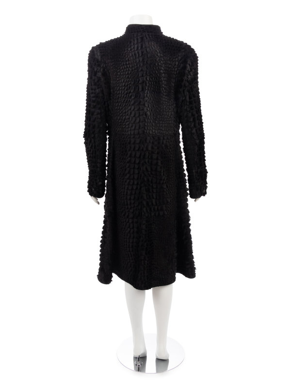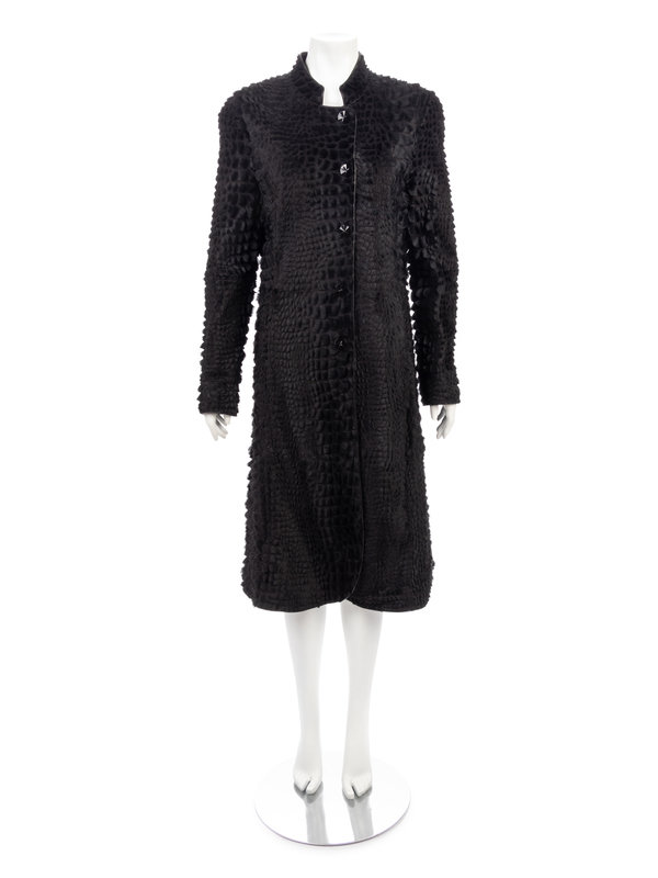 Black lambskin coat with crocodile pattern cut hair trimmed in black leather, stand collar, front button closure.