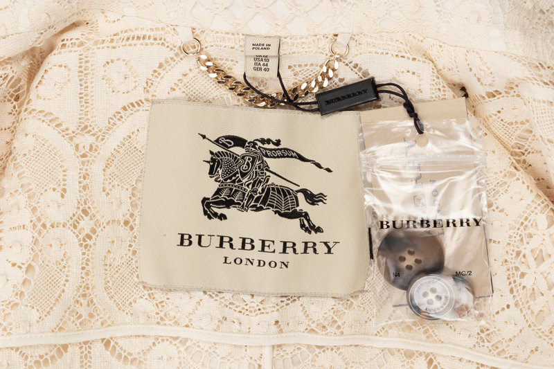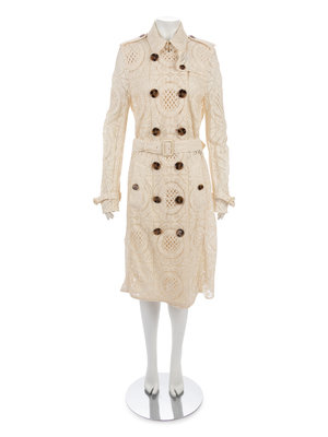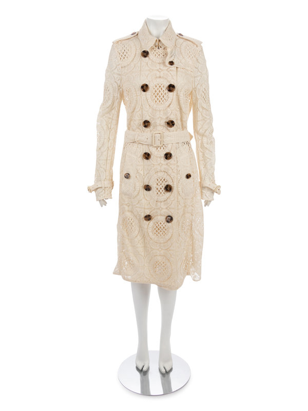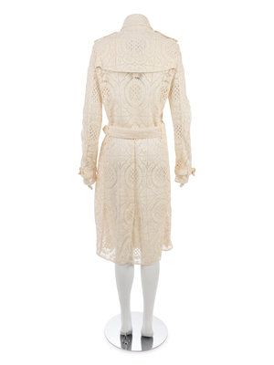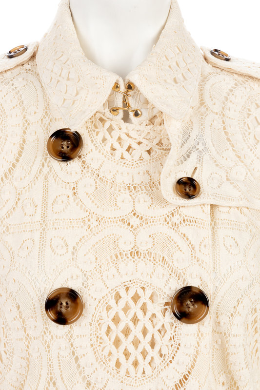 Parchment cotton blend crocheted lace double breast trench coat with epaulets, sleeve cuff cinches, front hip pockets, and matching belt. Found with original sales tag, listed price: $2,795.00.