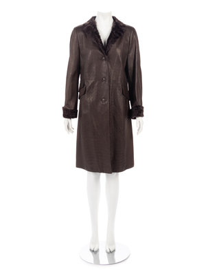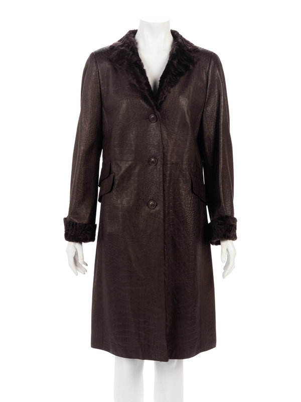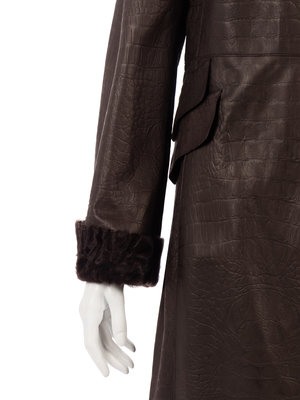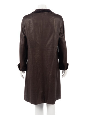 Brown lambskin leather coat embossed in a reptile pattern, lined with brown goat fur along the neckline, front opening and sleeve cuffs, and center front button closure.