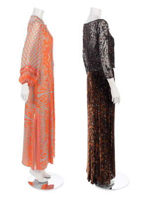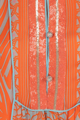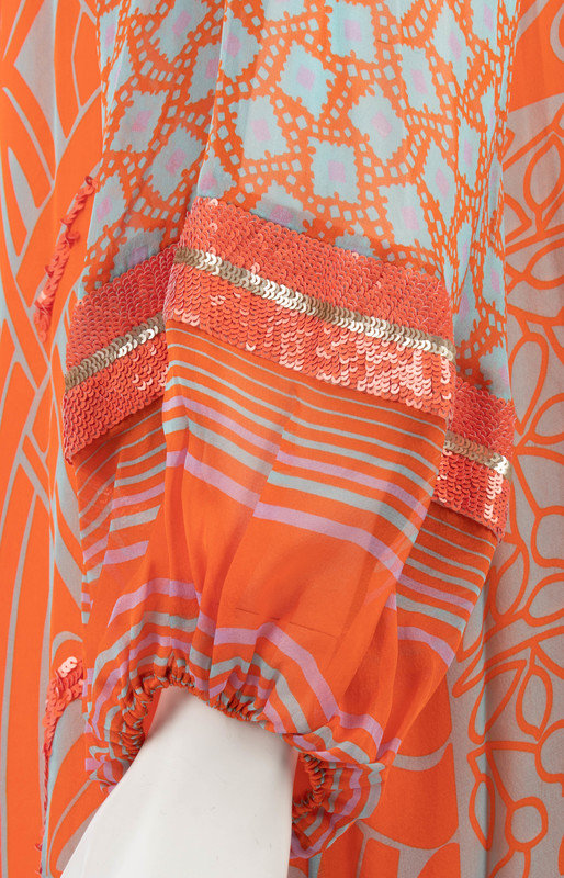 Orange and light blue print silk chiffon dress embellished with orange and gold sequins, full bishop sleeves, gathered front skirt, and globe rhinestone buttons on front bib. Found with original sales tag, listed price: $3,635.00.