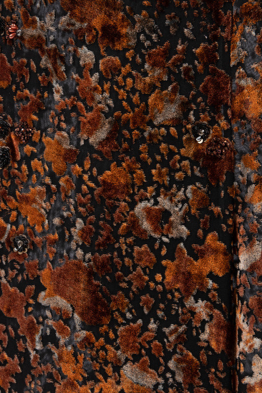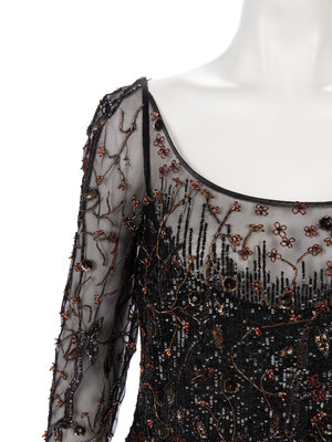 Black, copper, and gold beaded net topped silk blend evening dress with brown and orange floral motif voided velvet skirt and center back zipper closures.
