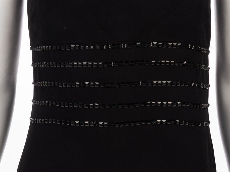 Black viscose crepe strapless evening dress embellished with black square cut beads at waist level and center back zipper closure.