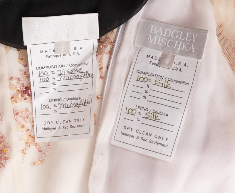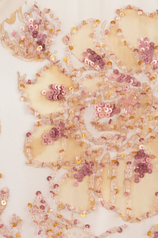 Cream silk chiffon and net with pink and yellow sequin embellished floral print. Found with original sales tag, listed price is missing.