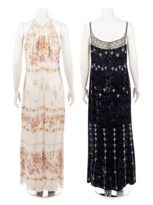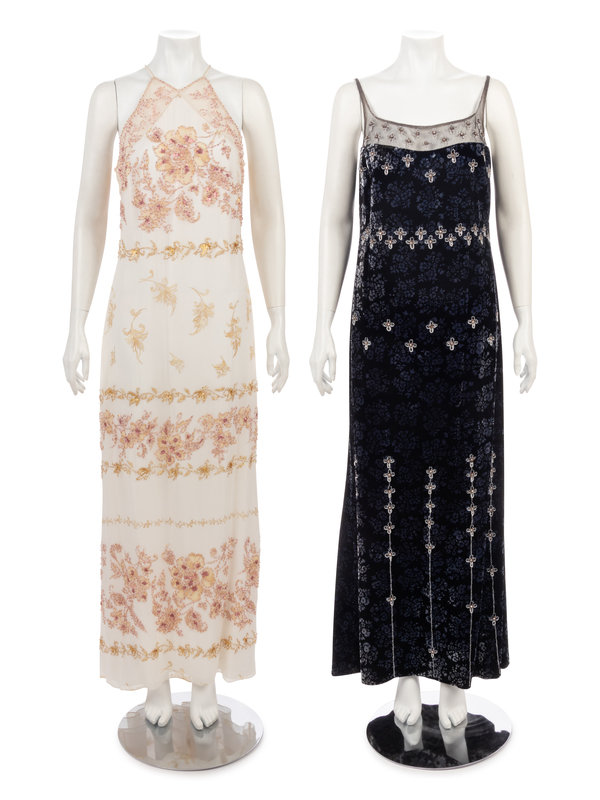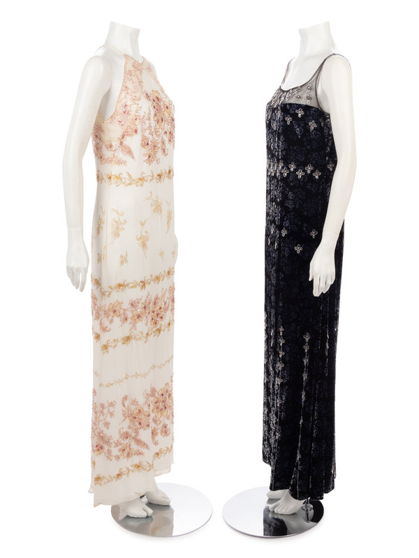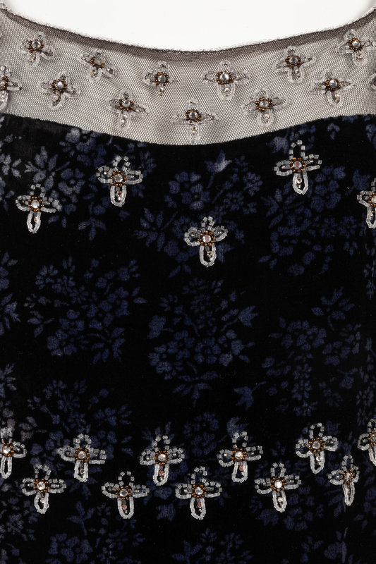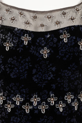 Black rayon microfiber velvet with silver floral print embellished with white beading and net neckline.