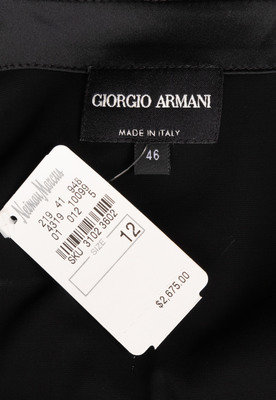 Black rayon blend knit wrap evening dress with black polyester blend satin cuffs and tie waist. Found with original sales tag, listed price: $2,675.00.