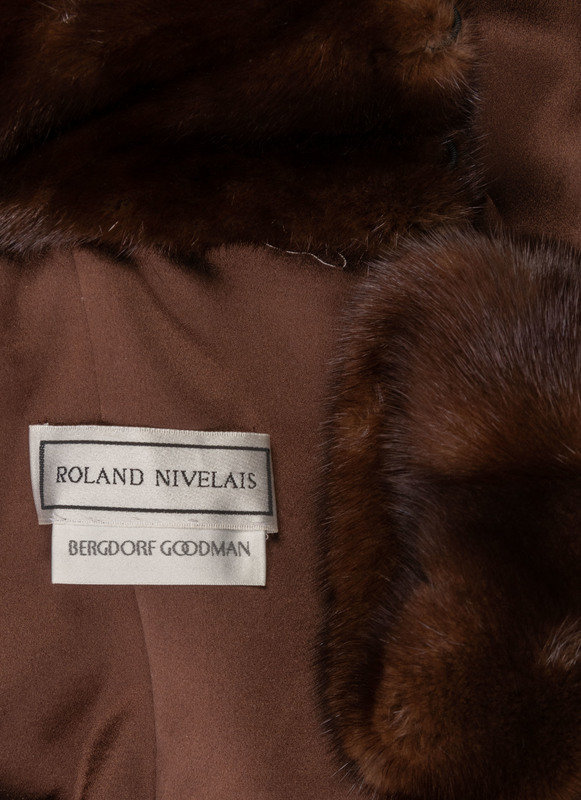 Brown satin long sleeve evening dress with open neckline trimmed in brown mink fur. Found with original sales tag, listed price: $3,740.00.