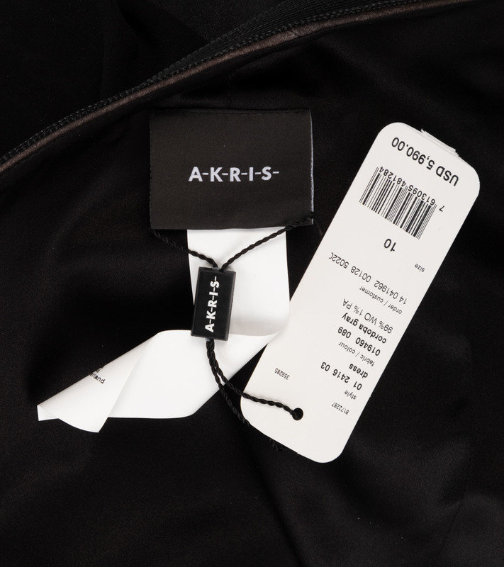 Printed gray wool blend broadcloth single shoulder evening dress with black silk chiffon and trimmed with black synthetic horsehair braid. Found with original sales tag, listed price: $5,990.00.