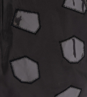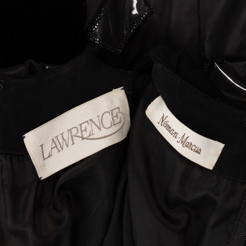 Black knit dropped waist evening dress with tiered black taffeta bubble skirt with clear vinyl appliques and black velvet bow.