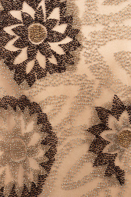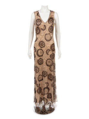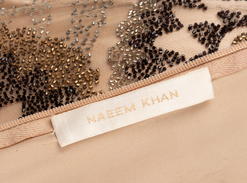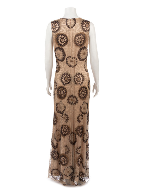 Nude evening dress embellished with gold, bronze, and brown beads in floral motif on net overlay and center back zipper closure.